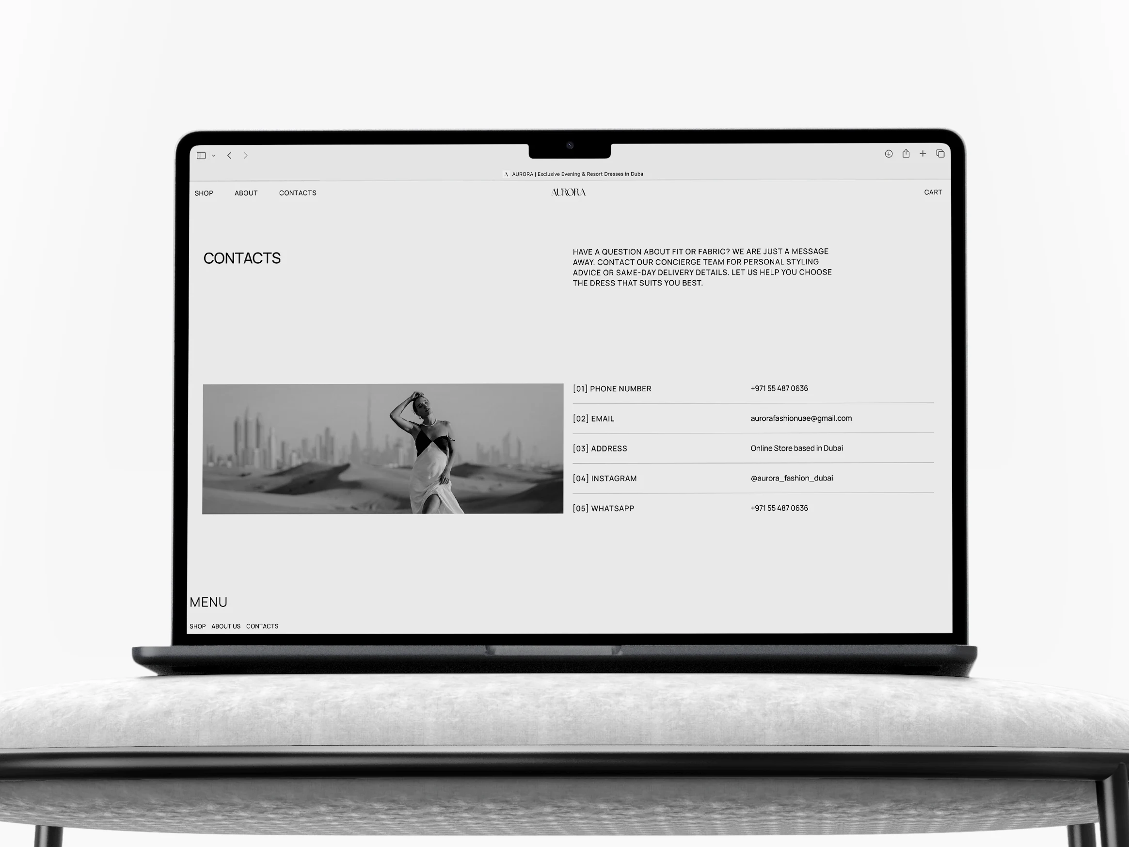Візуальний стиль проєкту побудований на концепції «тихої розкоші». Використана тепла бежево-пісочна гама та елегантна типографіка (шрифт Brown Sugar), що підкреслює характер бренду. Інтерфейс спроєктований з акцентом на контент: мінімалістичні картки товарів та якісні фото дозволяють детально роздивитися фактуру тканин. Враховуючи, що основний трафік йде з Instagram, ми приділили особливу увагу мобільній версії. Важливою частиною розробки стала адаптація форми замовлення: впроваджено вибір Емірату та специфічні поля для адрес, звичні для жителів регіону, що виключає помилки при доставці.