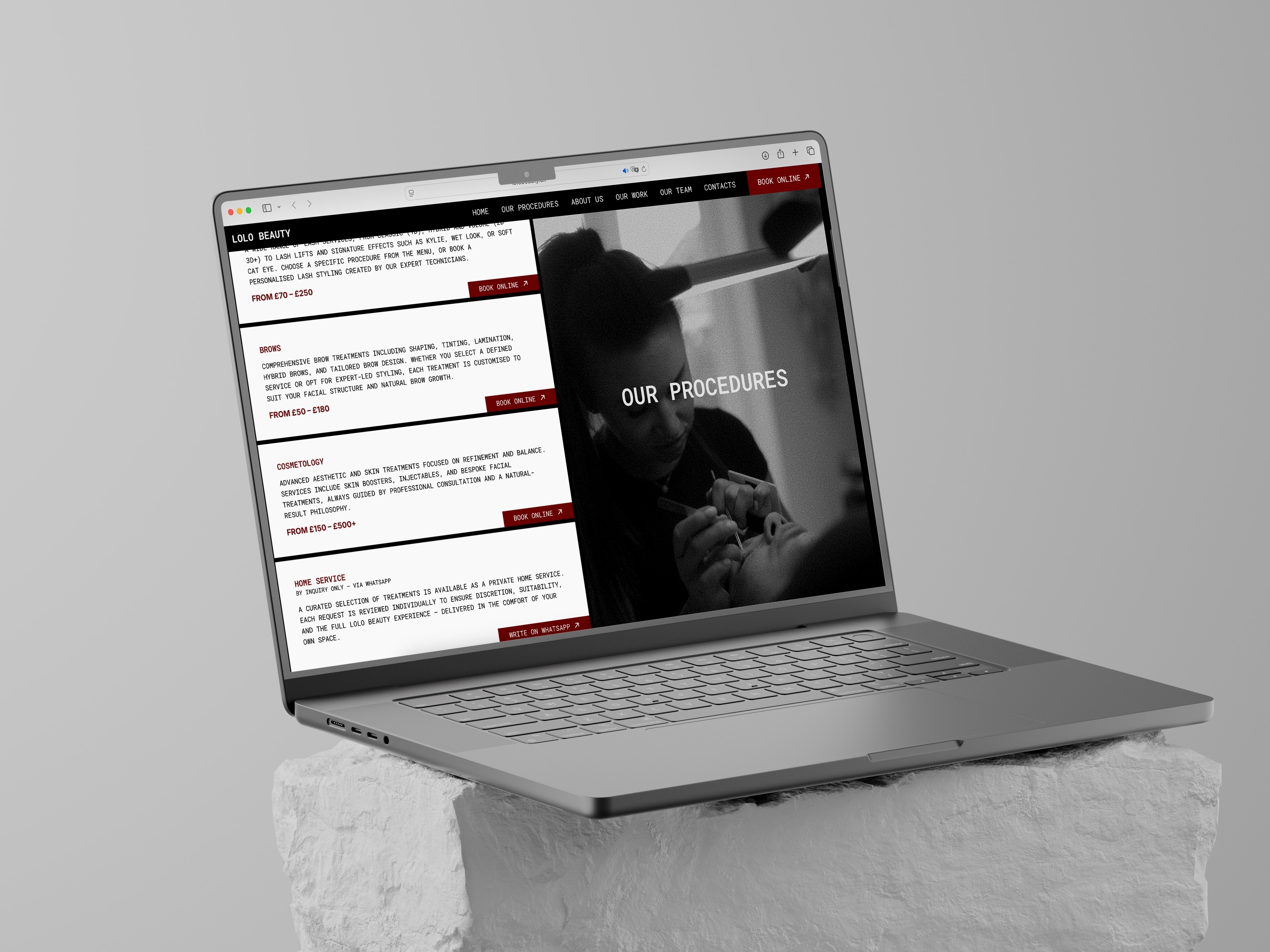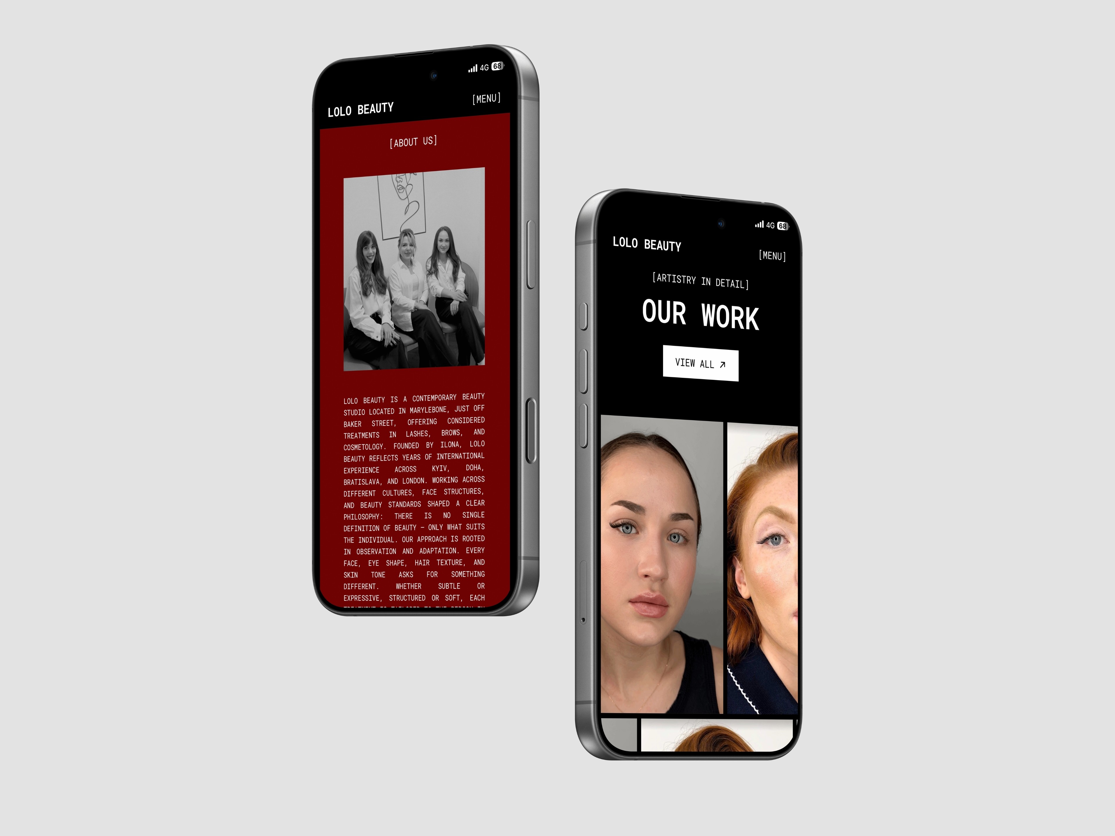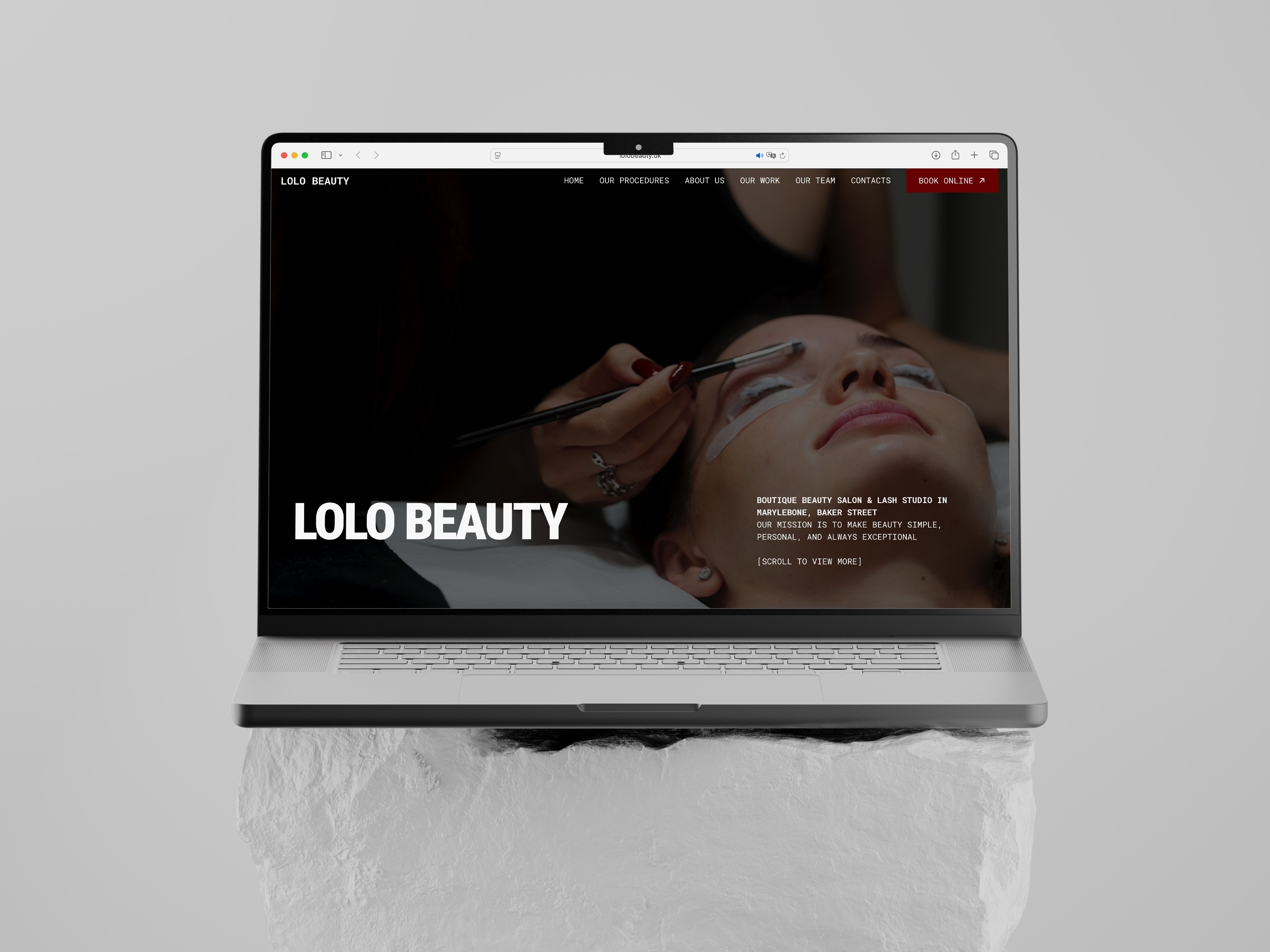 Розробити іміджевий сайт для б'юті-студії LOLO BEAUTY у Лондоні. Стояло завдання відійти від шаблонних «ніжних» сайтів салонів краси та створити ресурс із сильним, незабутнім характером. Дизайн мав транслювати експертність та преміальний рівень послуг, а також ефективно конвертувати відвідувачів у запис.
