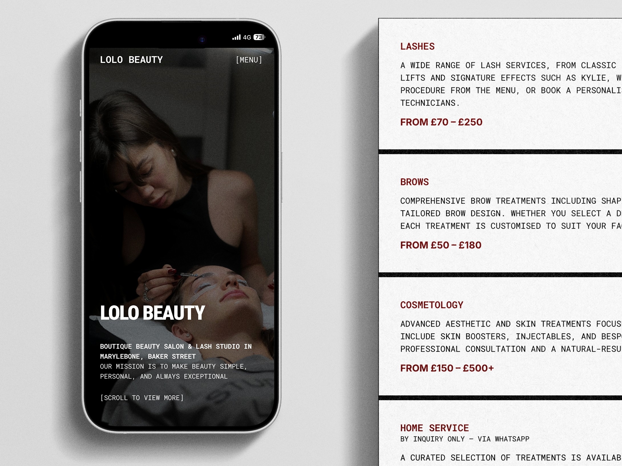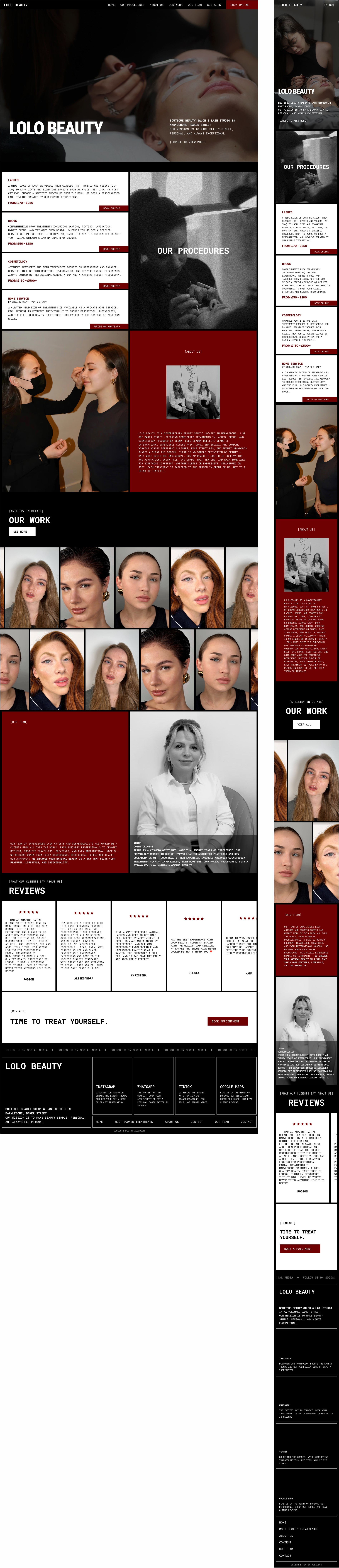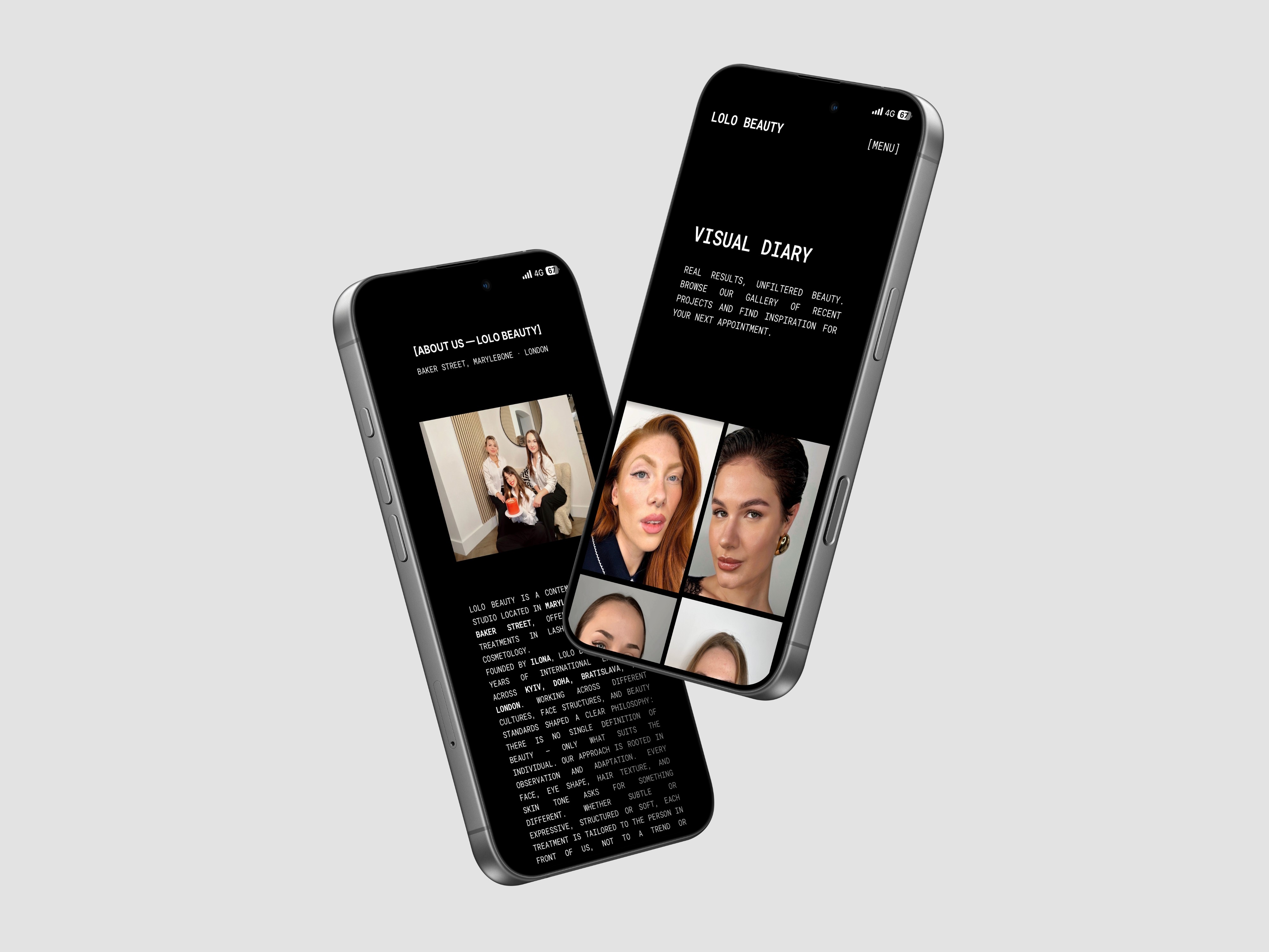 Розробити іміджевий сайт для б'юті-студії LOLO BEAUTY у Лондоні. Стояло завдання відійти від шаблонних «ніжних» сайтів салонів краси та створити ресурс із сильним, незабутнім характером. Дизайн мав транслювати експертність та преміальний рівень послуг, а також ефективно конвертувати відвідувачів у запис.
