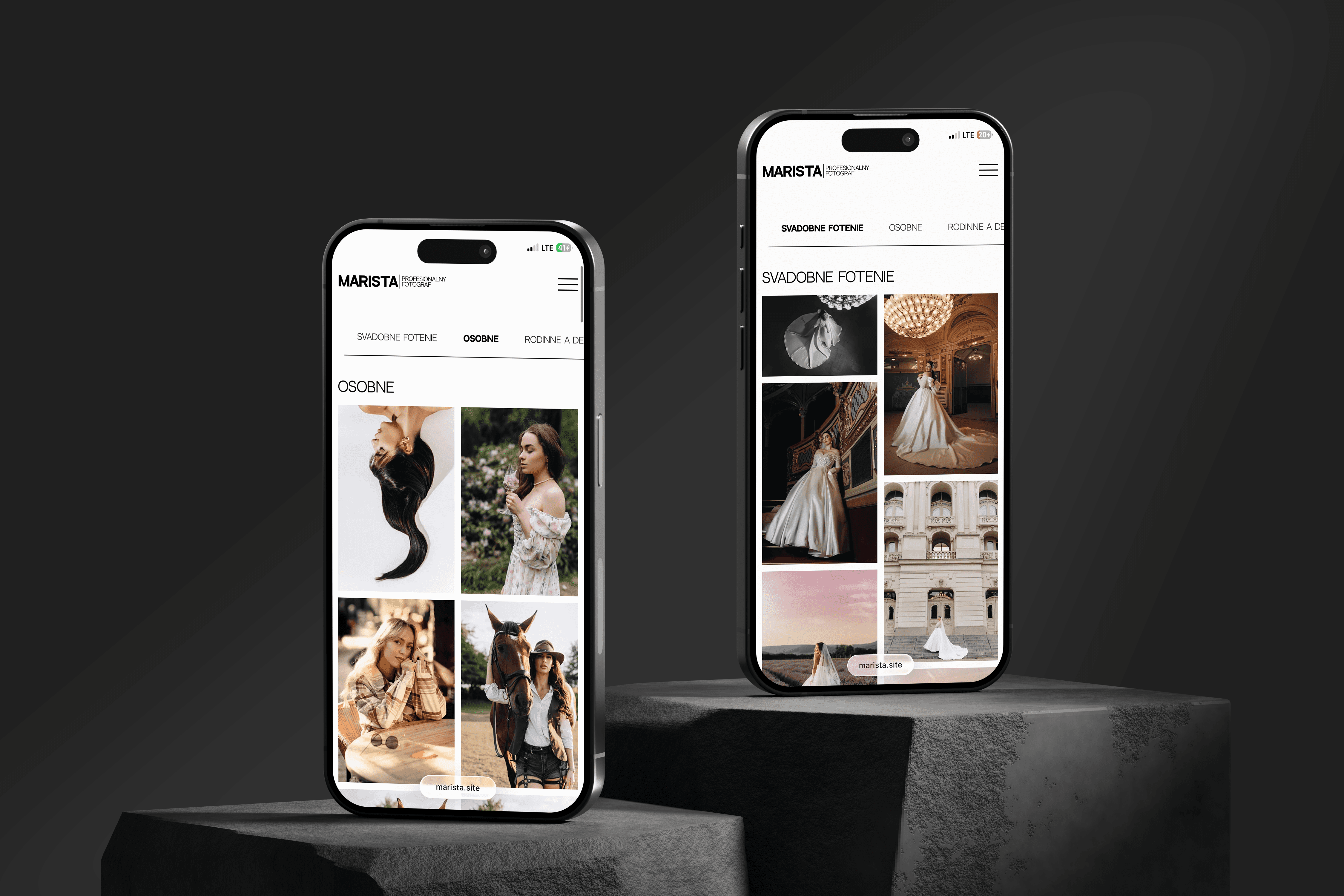 Структура: Головна сторінка зустрічає відвідувача іммерсивною сіткою , що одразу задає тон. Портфоліо чітко розділене на категорії (Портрети, Сім'ї), а послуги та інформація про автора винесені в окремі блоки, що легко читаються.