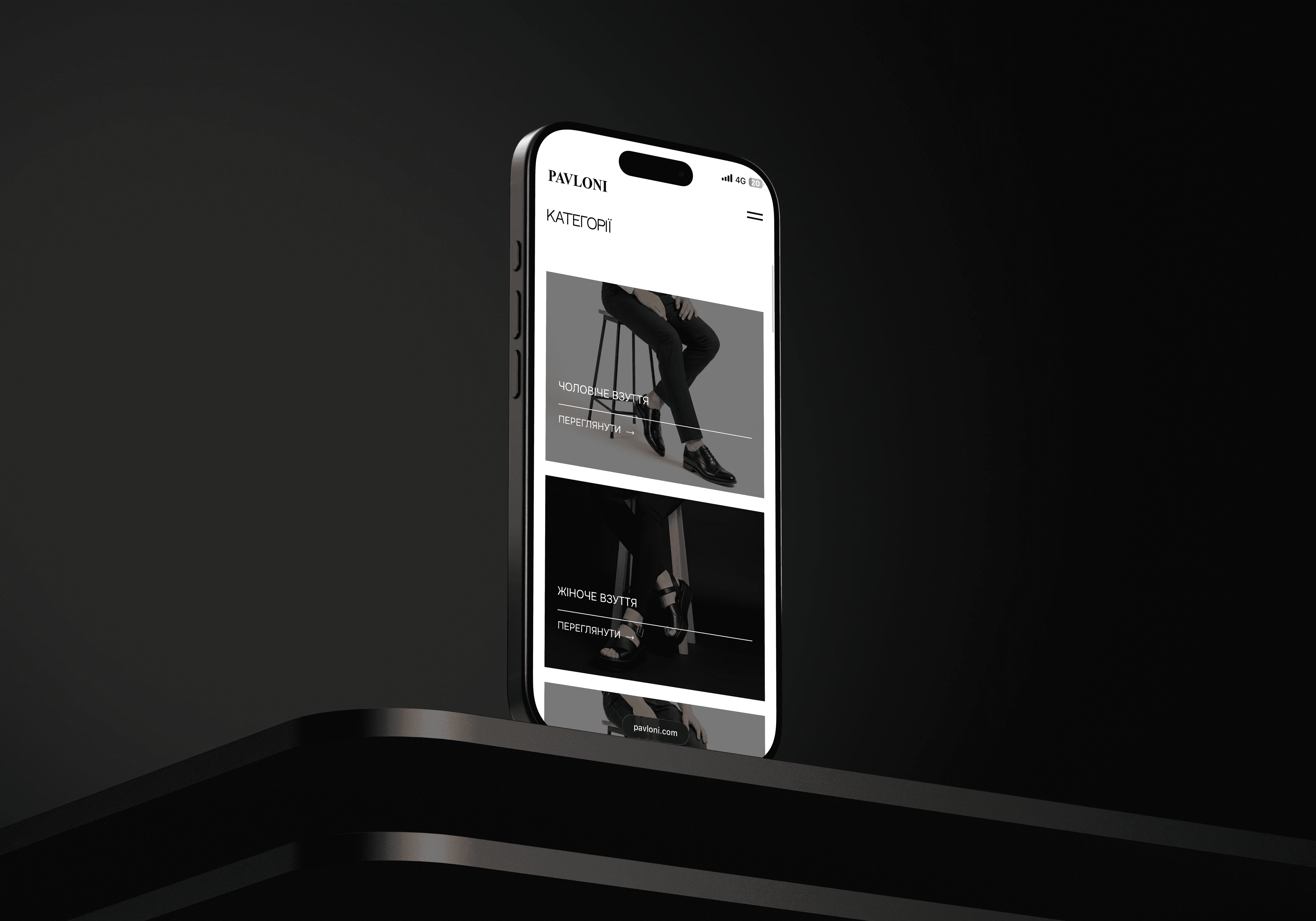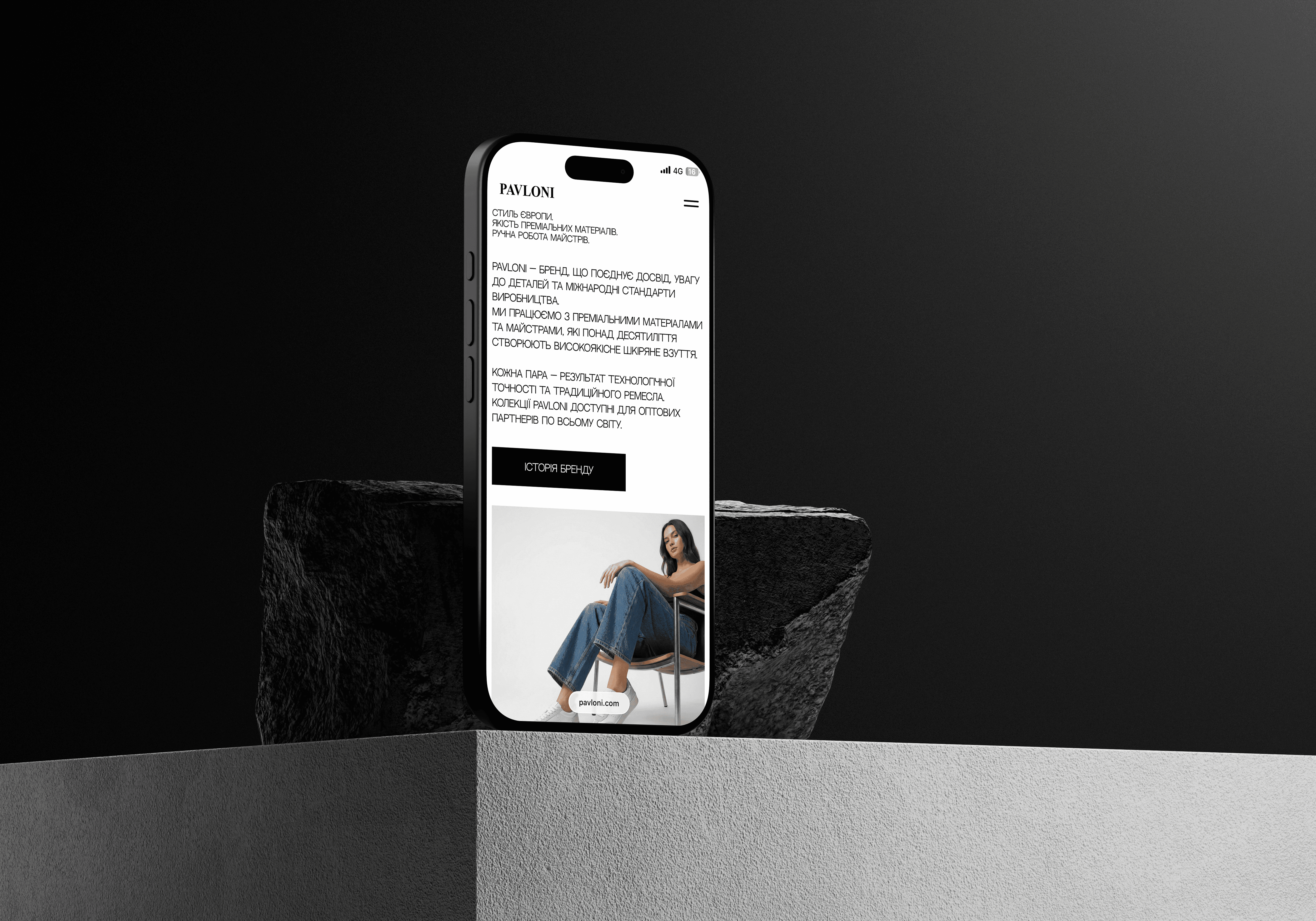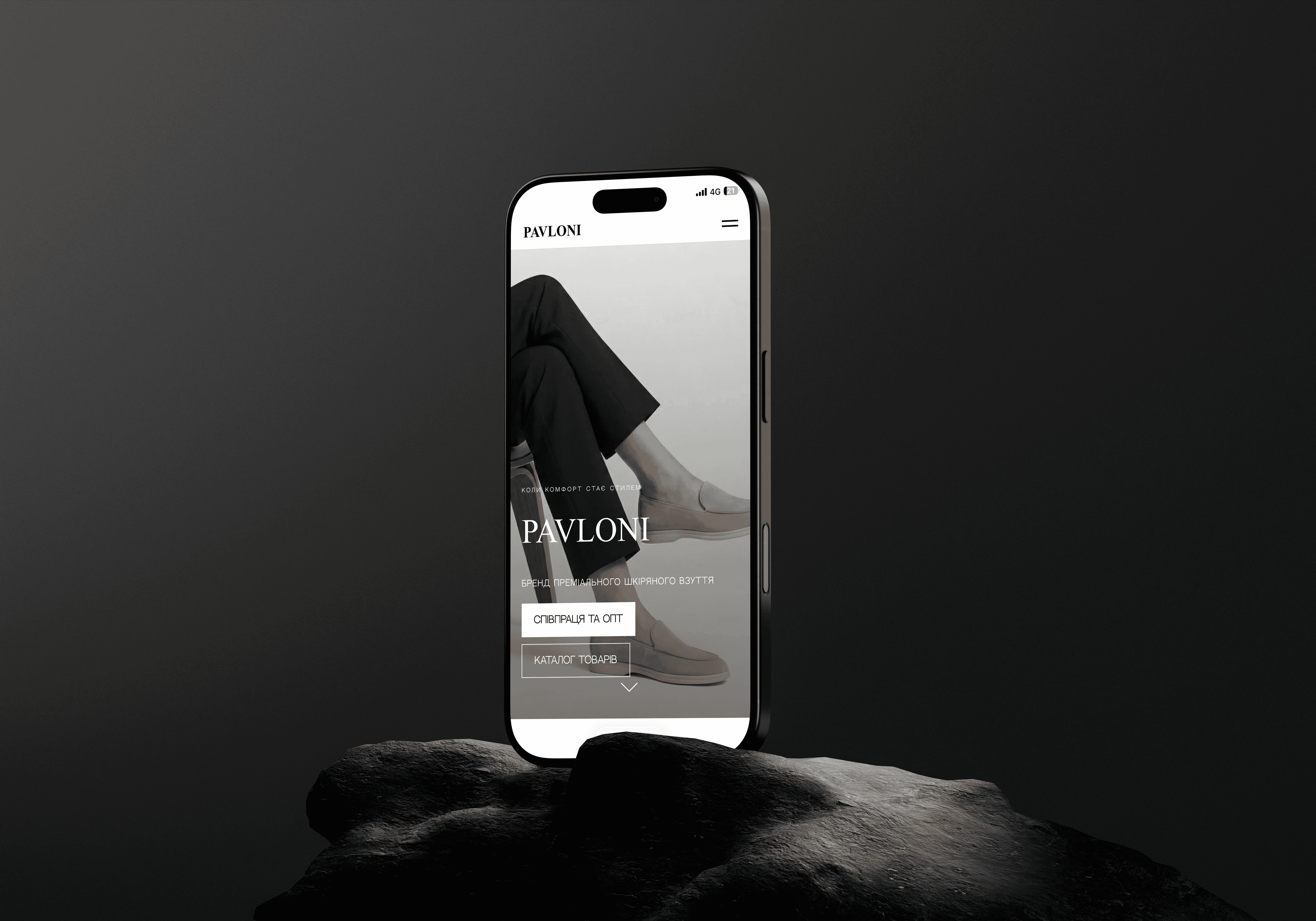 Розробити строгий іміджевий сайт-каталог для виробника преміального шкіряного взуття Pavloni. Основна мета — створити «цифрову вітрину», яка транслює статус бренду та знайомить оптових і роздрібних клієнтів з колекціями. Сайт не повинен виконувати функції інтернет-магазину; його завдання — презентувати продукт та перенаправляти зацікавлених користувачів у соціальні мережі та месенджери для оформлення замовлення.